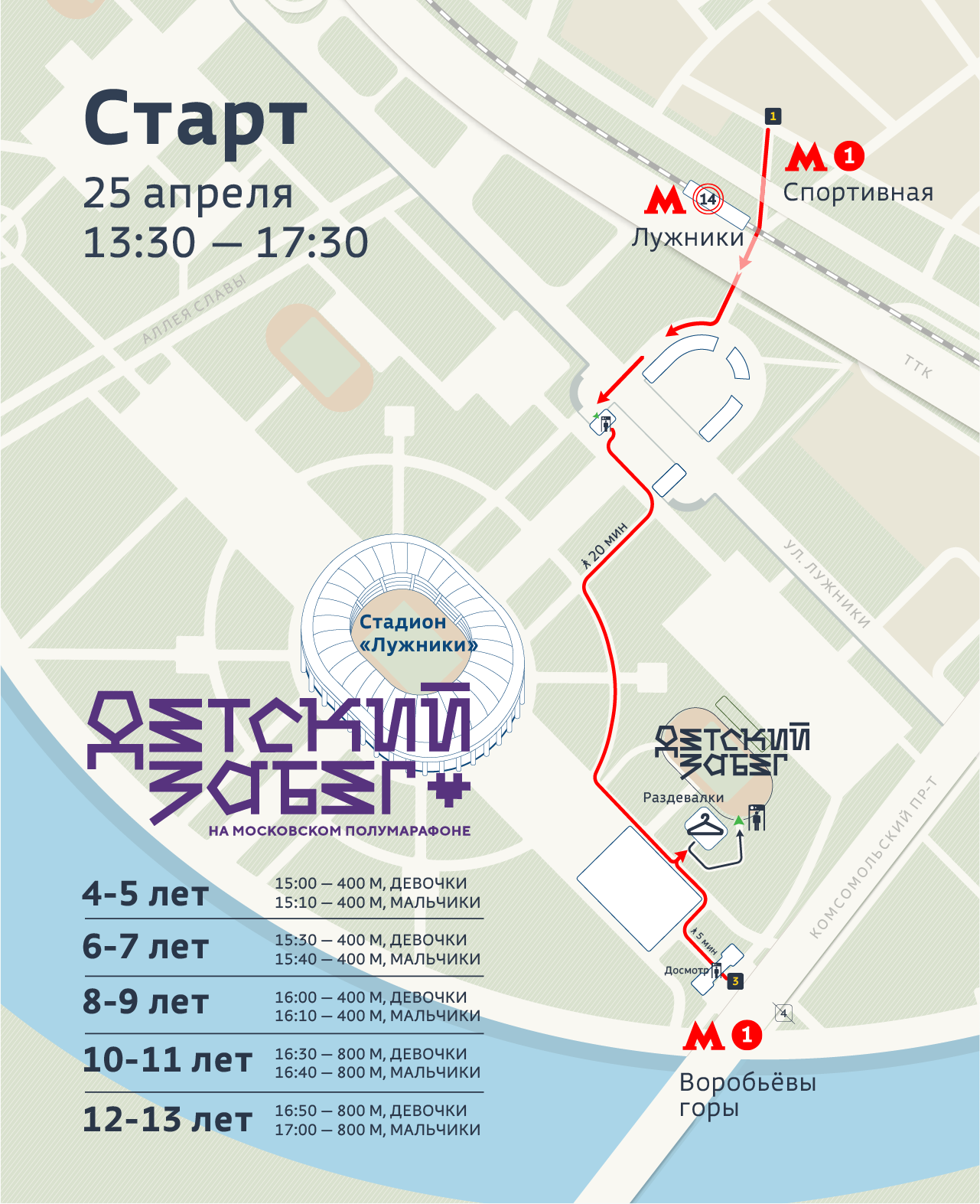 Детский забег пройдёт 25 апреля 2026, в первый соревновательный день Московского полумарафона. Принять в нём участие могут все желающие от 4 до 13 лет. В зависимости от возраста участники пробегут дистанции 400 или 800 метров.