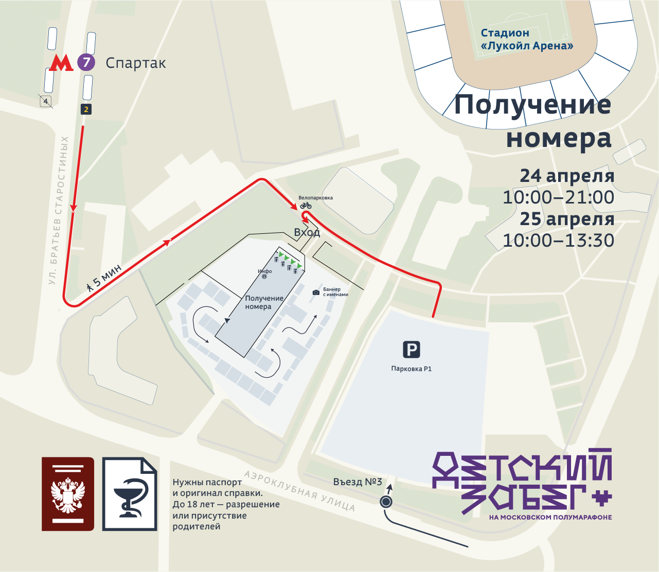 Приезжайте в пятницу 24 апреля с 10:00 до 21:00 или в субботу 25 апреля с 10:00 до 13:30 в место выдачи стартовых пакетов. Предъявите следующие документы: